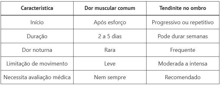 Muitas pessoas confundem dor muscular comum com tendinite no ombro. Veja as diferenças principais: